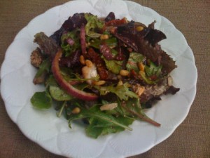 Print Bistro Salad* Print Recipe 5 Stars 4 Stars 3 Stars 2 Stars 1 Star No reviews Author: Cooking For Bimbos Ingredients Scale 1x2x3x 2 tablespoon good olive oil 2 tablespoons balsamic vinegar 1 clove garlic minced finely 1/4 cup sundried tomatoes in oil 4 cups spring mix greens 1/4 cup pine nuts 1/2 small…